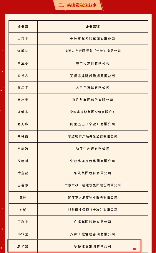 區(qū)委書(shū)記徐強(qiáng)出席大會(huì)并致辭,區(qū)委副書(shū)記、區(qū)長(zhǎng)葉枝利主持,區(qū)政協(xié)主席張寧輝等參加,區(qū)委副書(shū)記羅仙兵宣讀表彰文件。華恒建設(shè)集團(tuán) 虞和定 董事長(zhǎng)獲評(píng)“海曙區(qū)突出貢獻(xiàn)企業(yè)家”榮譽(yù)稱號(hào)。